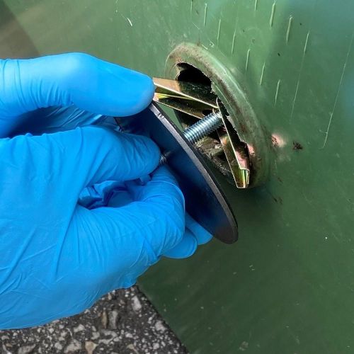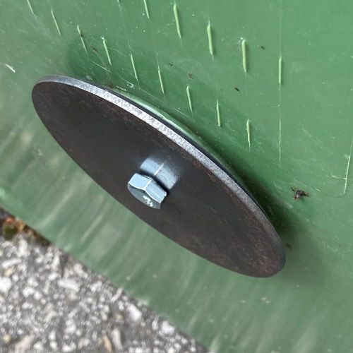 Gryzonioodporna zaślepka zabezpieczająca duże pojemniki na odpady przed dostępem gryzoni. Łatwa w montażu i demontażu w kilka sekund. Wykonana z blachy stalowej 2mm, podkładki z neoprenu i galwanizowanej kotwy sprężynowej.