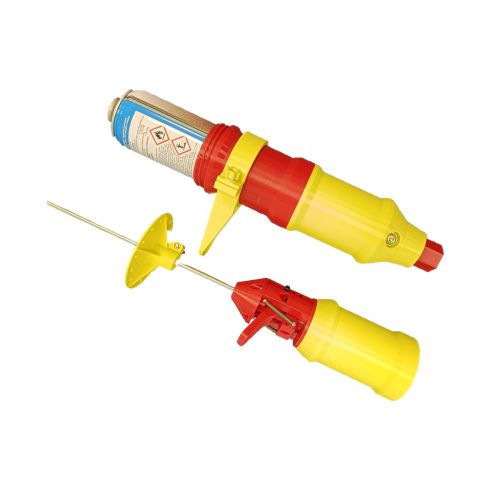 Uwolnienie preparatu z puszki następuje po dociśnięciu żółtej obręczy do gniazda lub po pociągnięciu za linkę przymocowaną do czerwonego spustu.