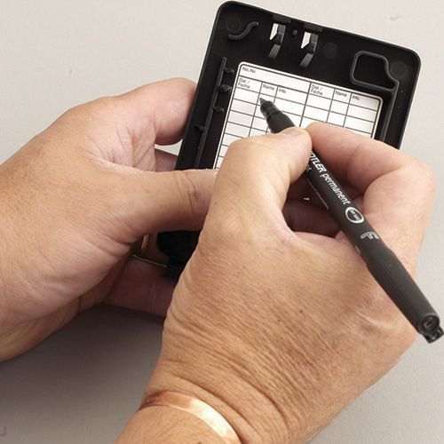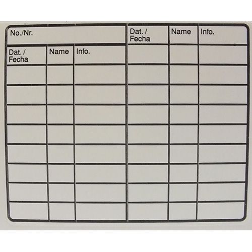 Etykieta samoprzylepna do prowadzenia zapisów wewnątrz stacji. Na etykiecie znajduje się miejsce do wprowadzenia zapisu: nr urządzenia, daty sprawdzenia, inicjałów prawdzającego, informacji o aktywności.Jedna etykieta zawiera 17 linii do zapisu. Wymiar etykiety 6 x 5 cm. Opakowanie zawiera 5 arkuszy po 10 naklejek.