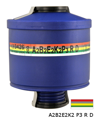 Filtropochłaniacz A2B2E2K2P3 R D włoskiej firmy Spasciani, ze standardowym gwintem RD40 1/7 (zgodnym z EN148-1). Do ochrony przed parami organicznymi o temperaturze wrzenia wyższej niż 65 °C, nieorganicznymi gazami i parami, dwutlenkiem siarki (SO2), amoniakiem (NH3) i jego pochodnymi, oraz przed pyłami, dymami i mgłami.