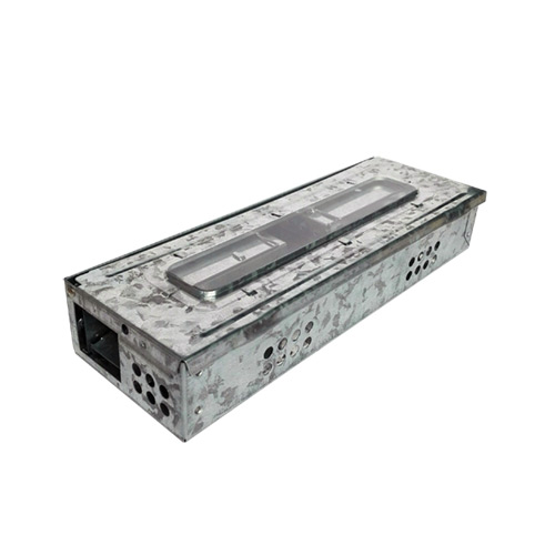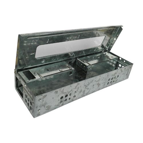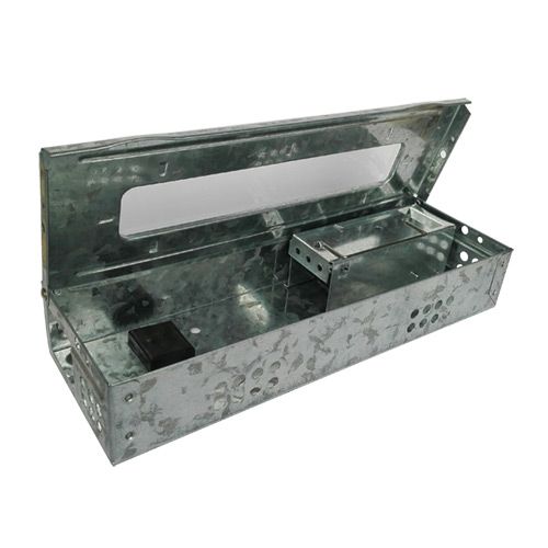 Metalowa pułapka żywołowna z "szybką" kontrolną umieszczoną wm górnej pokrywie.
