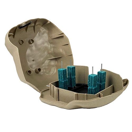 Szeroko otwierana stacja deratyzacyjna w formie kamienia. Doskonale wtapia się w otocznie. Idealna do stosowania w miejscach gdzie kontrola gryzoni wymaga szczególnej dyskrecji. 4 pionowe pręty zabezpieczające trutkę w formie kostki lub pasty. Jeden